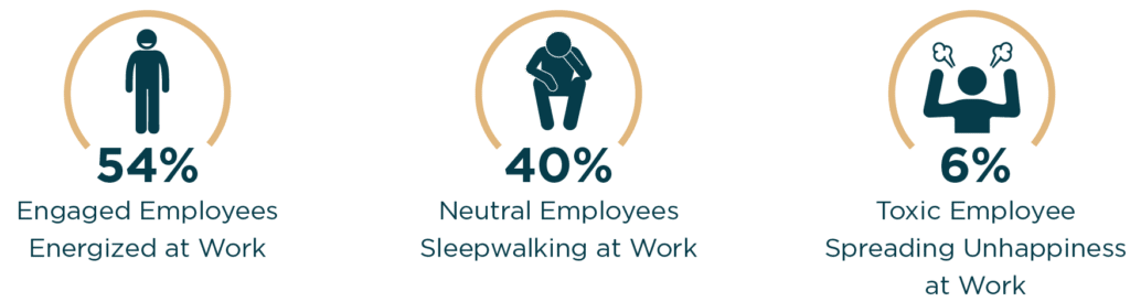 But here’s the bad news—40% of the workforce is neutral—they are not feeling engaged by their work. These neutral employees are a signal of an unhealthy culture. They are occupying space in your organization but are not working with energy or passion. As they “sleepwalk” through their days, they put their organizations at risk for lackluster results or worse.